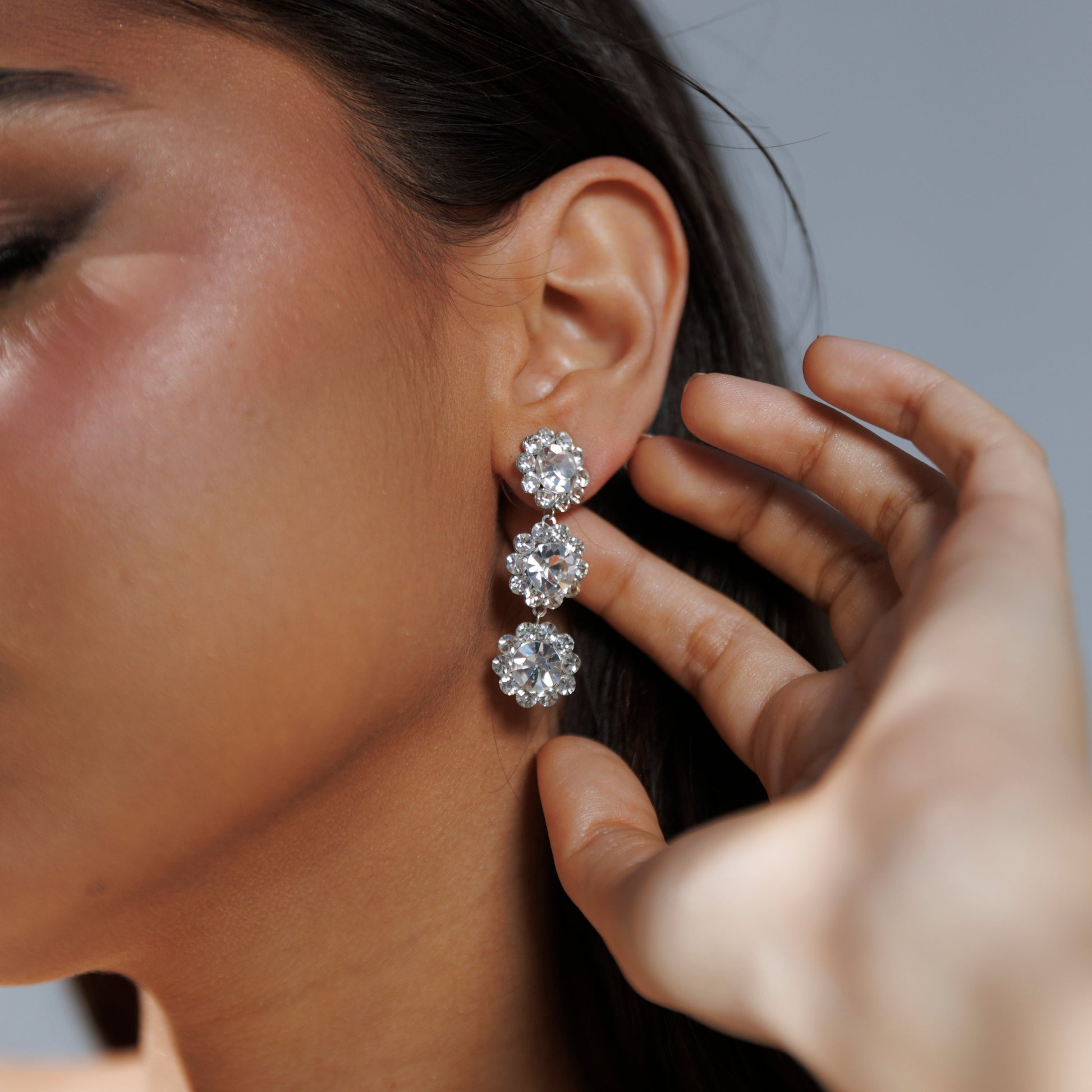 Brinco longo com três flores cravejadas em cristais. Destaque elegante para noivas que amam acessórios marcantes.