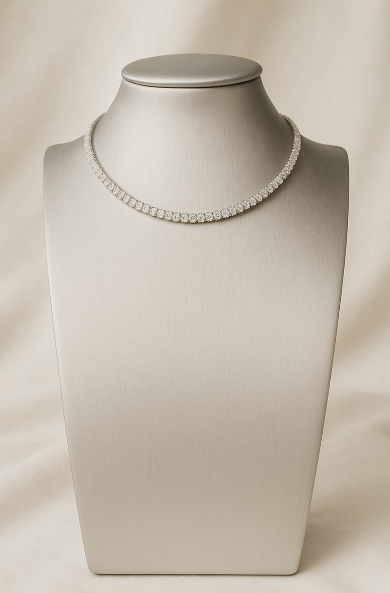 Colar delicado em modelo choker, composto por cristais finamente alinhados que refletem a luz com elegância. Com design minimalista e sofisticado, é ideal para noivas ou ocasiões especiais que pedem um toque de brilho sutil.