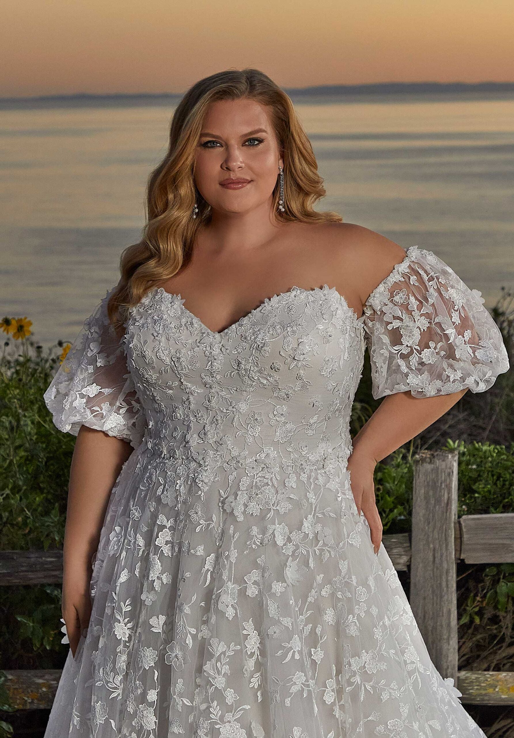 Vestido com renda floral, mangas bufantes removíveis e decote coração. Visual romântico com cauda longa e volume leve. Elegância com toque delicado.